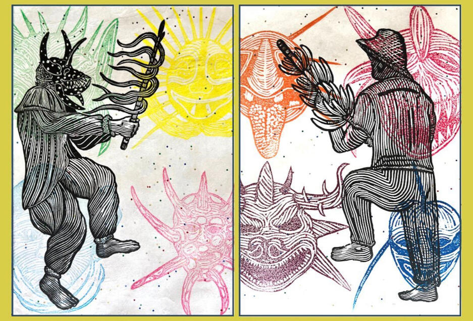 Dar y recibir (to give and receive) is a print installation that incorporates Voodoo, Santeria and Christian imagery to describe how colonialism has altered the life and religion of Caribbean people. Cloth was a major carrier of disease and aided in the transference of small pox and other illnesses from European settlers to indigenous populations. This simple act of commerce ended in the almost complete destruction of native peoples. This piece is located diagonally from a Catholic church and offers a counterpoint for conversation of life before colonization.The center scene with three crosses highlights how the Christian religion was used, in addition to other tactical ways of gaining power and influence. Here, a child takes his last breath as an angel flies out of his mouth, symbolizing the soul leaving his body. Three crucifixes show bodies in a transcending motion as they levitate above the little boy. Their bodies are riddled with several dots, which represent areas affected by small pox. Many passersby also describe the figures as shooting range targets- an interestingly simple and profound connection.The pyramid segment depicts an alter dedicated to the deity of the crossroads, Elegua. This Orisha, commonly found in Santeria, is derived from Voodoo. I chose Elegua for this installation because the building is on one of four corners, that being a crossroads. He also holds the keys to the past, present, and future which is the perfect descriptor for the installation as a whole.The 3-dimensional cloth element segment highlights the transference of diseases from Europeans to Native peoples. The cloth is printed with a woodblock design commonly found on Victorian wallpapers. The use of multiple art styles that span from the Renaissance to today is a representation of how prevalent colonialism is entwined in our everyday lives.The segment of various square prints highlights the work of students that attended my woodblock pattern workshop in Tlaquepaque, Mexico. I wanted to incorporate their designs into the final installation because they have personally faced colonialism from Spain and the United States. Including their stories and images fostered local community involvement and translated the meaning of the installation even deeper. Their shared history and trials of experiencing colonialism, similar religions and personal trials show how cyclical the experience of the native person is and how often our patterns connect.