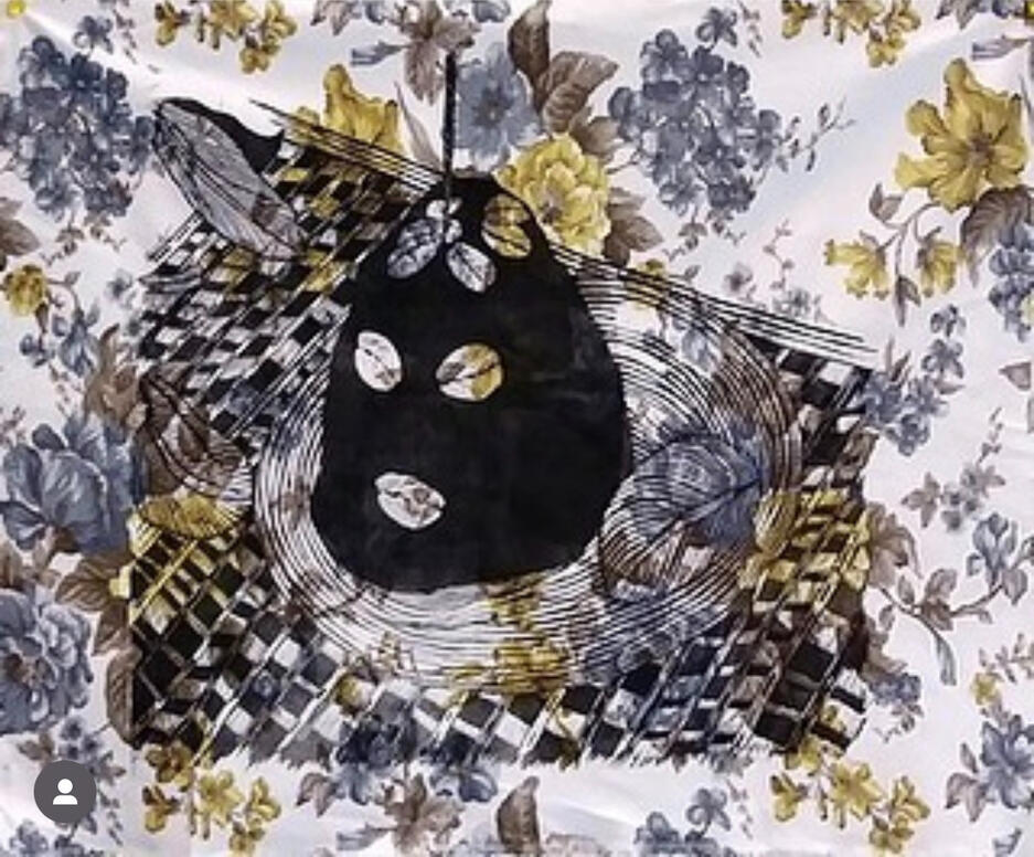 Repetition, ritual and disease- these elements have the ability to spread from person to person through physical and spiritual environments, some a choice and some more intrusive and involuntary much like the pandemic we see today.I chose to print these woodblocks onto hand-printed floral cloth. The abstracted images of the altar to Elegua and the child experiencing small pox become ornamental and commonplace when placed in an external area. This parallels the idea about how our past informs the present and future. Many are still focused on forgetting as a way of acceptance and moving forward.