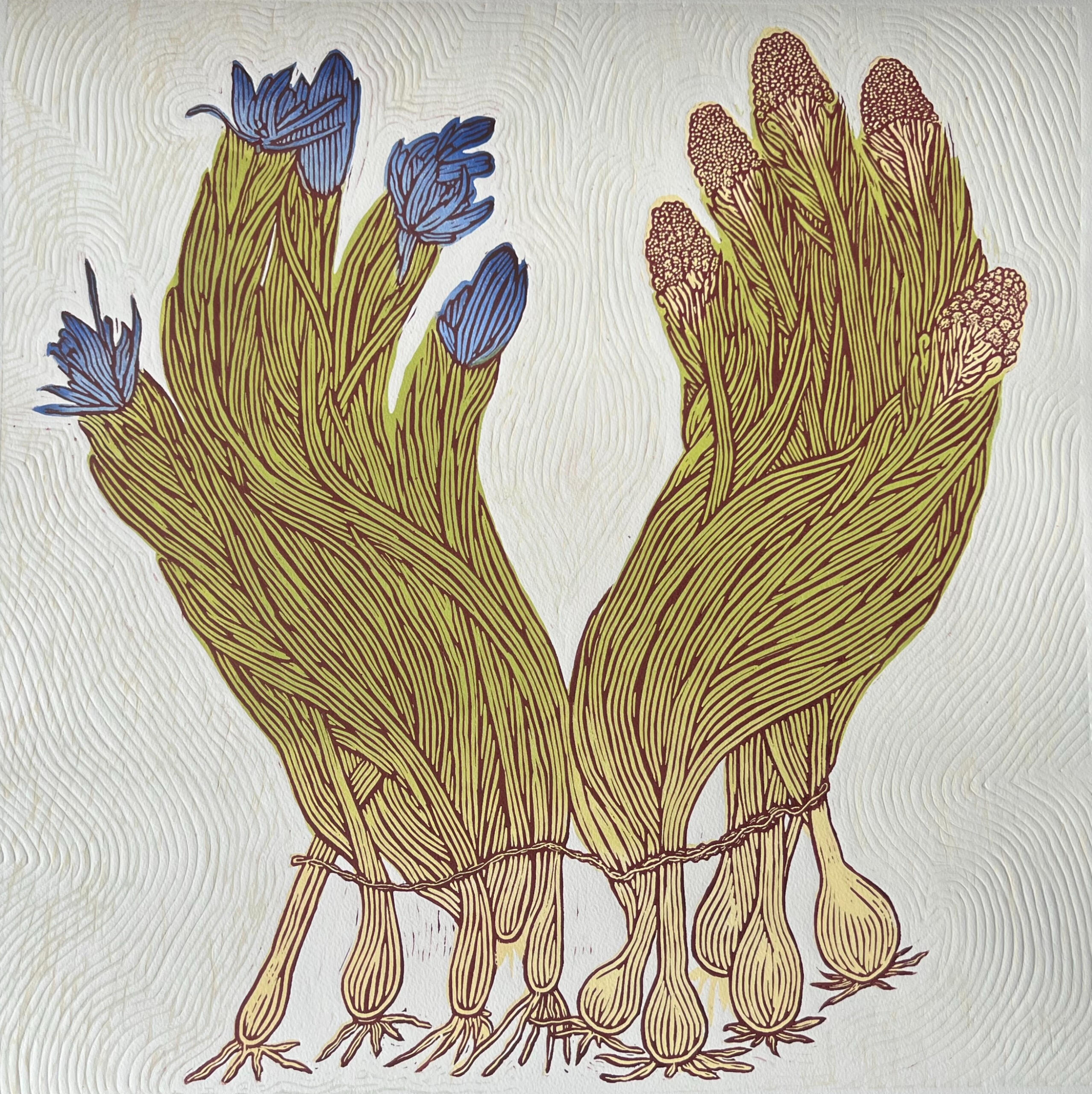 Woodblock print hand painted with natural watercolor pigment on unbleached linen