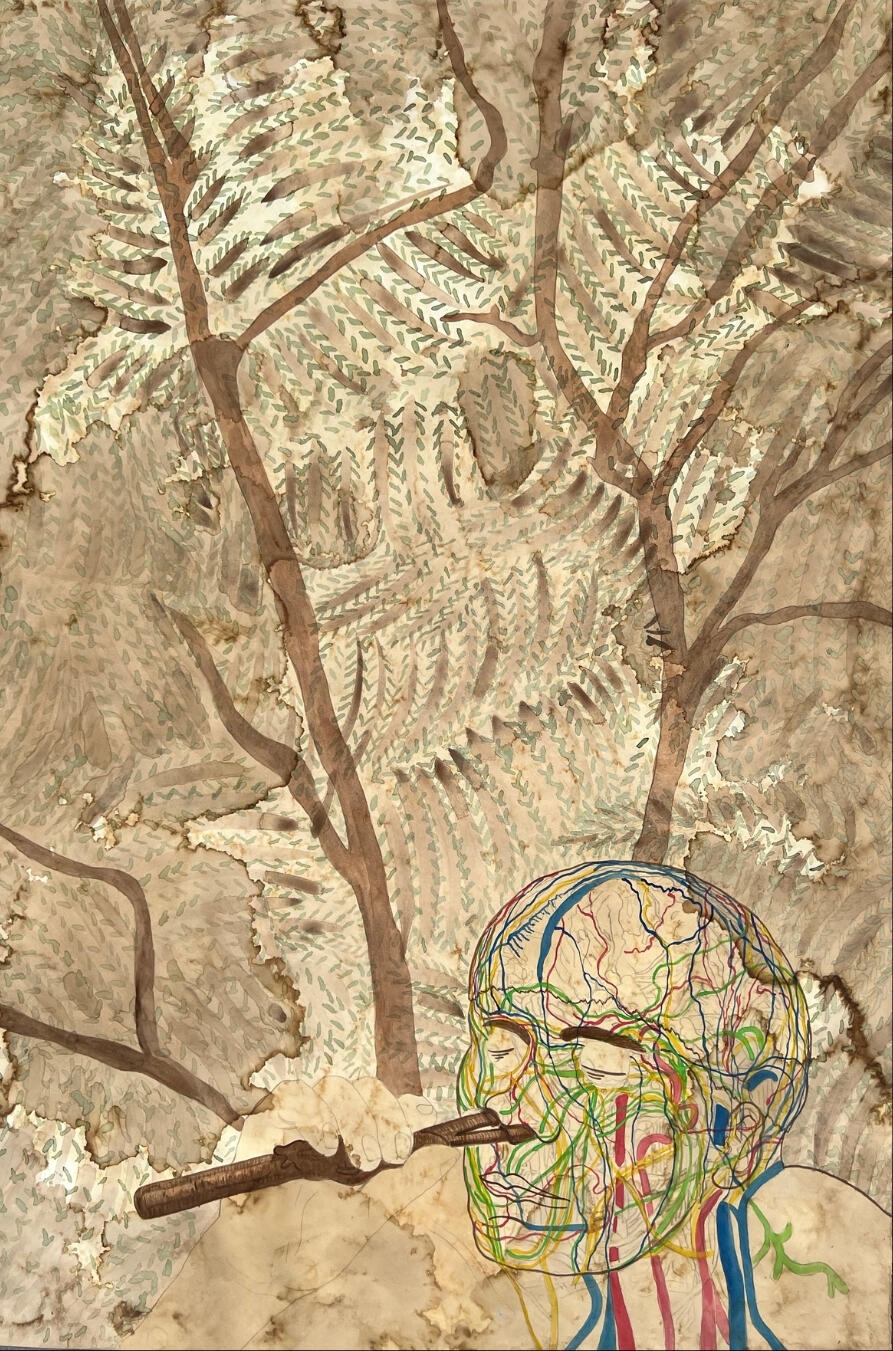 "I want to be a catalyst for change- to create an equitable community around different modes of practice, decolonize education and eliminate gatekeeping to encourage critical thought and discourse at any stage, and open museum and institutional spaces to self-taught artists and curators that highlight underserved and marginalized voices." - Jacoub ReyesI excavate my individual and ancestral biographies to unearth my cultural heritage. My layered identity invites me to see taxonomy as a system that requires decolonization. My mother is a first-generation Catholic Caribbean; my father is Muslim and a South Asian immigrant. My mom moved us from the industrial inner-city of the North to the expansive suburbia of the South, just as the war on Iraq gave way to a new wave of racism and Islamophobia. Later, I began to name the societal pressures that led to the self-removal of large parts of my racial and ethnic tapestry that reduced my proximity to whiteness. Much of my work synthesizes this research and uses the body metaphorically to symbolize complex internal emotions associated with the colonial and diasporic experience.My caretaking work in gardens led to research on restoring natural areas through reintroducing and cultivating native plants, animals, and insects. I found myself outside in the Florida sun many days, working with many of the subjects and themes now present in my work. The anthropomorphic figures of the natural world ingrained in my large woodcarvings and installations identify unresolved tension and stress. I am invested in dismantling the boundaries between oral history, academia, personal stories, and ancestral trauma; instead, I see these as essential parts of a complete narrative. I aim to redefine the trauma responses of fight, flight, freeze, and fawn as instruments of colonization. Primarily, my work focuses on re-contextualizing Caribbean art through a diasporic lens.I challenge the contemporary communication of the mixed-race or multi-cultural experience. Mixed cultural identity is not relegated to a hyphenated background; but rather a sum of all parts that are interdependent and foundational. The faceless figures of invasive and native plants examine the multiplicity of colonization. Displaying native and invasive plants in various tensions and settings upheaves how we see and experience race, class, and ability. My process to create these works involves finding materials, making tools, and printing without a press or traditional technologies. I work within a space deeply grounded in tradition but flourishes only due to innovation and creativity.BIO