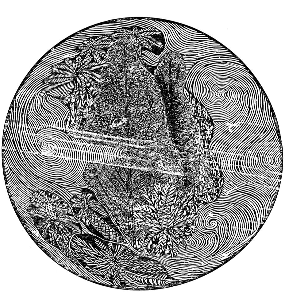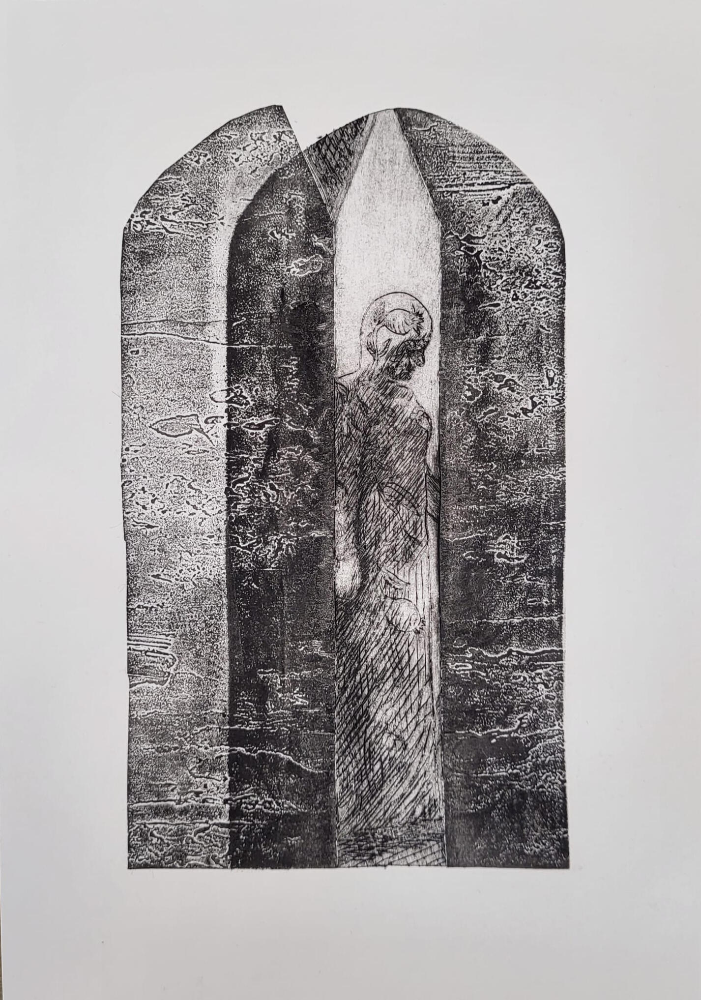 2025Cueva del murciélago references an earthenware half-rounded buffware Taino bowl housed in the Jenny and Lewis Krevolin collection in the Alfred University Ceramic Museum. This piece has incised decorations and lateral handles adorned with an anthropomorphic figure that is half bat and half human, reflecting the Chicoide style. Bats are a prevalent motif in Taino art, and these bat-headed adornos were attached to the sides of pots, both serving as handles and conveying the Taino worldview. Bats hold significant meaning due to their association with caves—considered gateways to the supernatural realm—and their nocturnal activity when spirits are believed to wander the forest.This vessel, along with four others, are loosely documented and have limited provenance information, raising questions surrounding ethics of collecting cultural artifacts, access, equitable museum practices, and due diligence. I created this print with raw materials similarly found in the pieces to create these woodblock prints. My goal with this piece is to honor my ancestors beliefs and work while holding colonial systems accountable.La Tumba